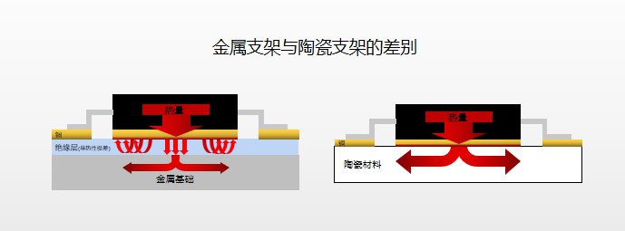 铝支架:金属支架的一种,金属本身具有良好的导热能力,但是因为金属本身导电,无法做到电热分离,相对于陶瓷基板来讲还需要多一道绝缘工艺。且由于有绝缘层这个“猪队友”,金属支架的散热性能也就比塑料高一些。如果用在汽车大灯的时候就需要比较好的散热设计进行匹配,不然的话,结温依然会很高,结温高了就会导致光衰,时间长了大灯的亮度就会急剧衰减。并且散热设计中的风扇散热器等成本会高很多,同时还占据了更多的空间。