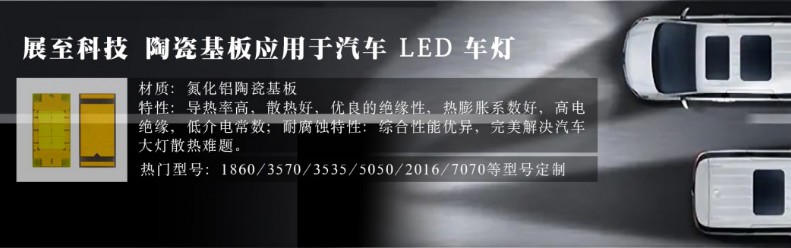 氮化铝陶瓷支架:算是目前汽车LED大灯应用较多的支架,相比已经很优秀氧化铝陶瓷基板而言,导热系数高出5倍以上,比铝基板将近高100倍,是大功率的大灯是再好不过的选择了,且氮化铝基板的硬度会比氧化铝高很多,同时解决了陶瓷基板易碎的问题,膨胀系数低,与硅性能一致。使用氮化铝陶瓷为主要原材料制造而成的基板,具有高热导率、低膨胀系数、高强度、耐腐蚀、电性能优、光传输性好等优异特性,是理想的大规模集成电路散热基板和封装材料。展至科技认为,随着我国电子信息产业蓬勃发展,我国市场对PCB基板的需求不断上升,氮化铝陶瓷基板凭借其优异性能,市场占有率正在不断提升。