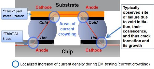 大多数关于倒装芯片无铅焊点电迁移的公开数据都与有机基板 (PCB)上的互连有关,几乎没有任何关于陶瓷基板上无铅焊点电迁移的信息;高铅焊料今天仍用于陶瓷上的互连。这项工作首次展示了对组装到薄膜Al上的硅芯片上标称直径为40 μm或30 μm且间距为100 μm的无铅 (SAC305) 倒装芯片焊接连接中电迁移的综合研究结果陶瓷基板。