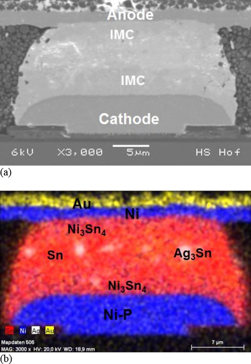 此后,对7个具有40μm焊料凸块的芯片组件和5个具有30μm凸块的组件进行了14KA/cm或25KA/cm的电迁移测试分别。到目前为止,40μm组件中有6个在7000小时后失效,而30μm组件在2500小时测试持续时间后没有一个失效。用SEM和EDX对失效样品进行的研发表明,微观结构在电流方面发生了不对称的变化。发现在焊料中形成了几种金属间相。发现互连的主要损坏发生在与芯片的阴极接触处;那里的Ni-P层显示出典型的柱状 Kirkendall 空洞,这是由Ni从层迁移到焊料中引起的。Ni-P和焊料之间的界面明显发生了接触失效。
