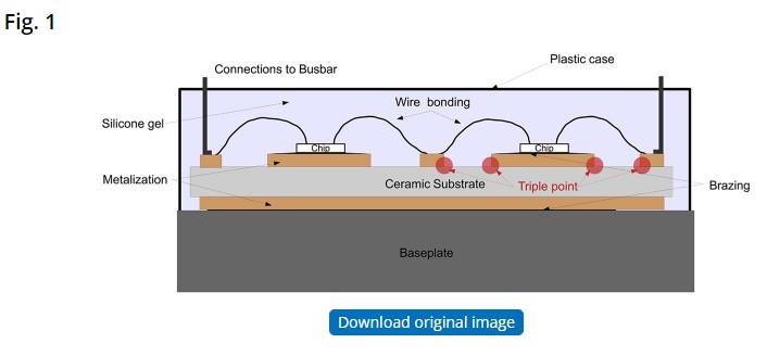 金属化通常由厚铜层进行,该铜层通过共晶键合工艺(直接键合铜、DBC)或活性金属钎焊工艺(AMB)与氧化物连接。然后将陶瓷基板固定在基板(例如AISiC)上,这确保了组件的机械完整性以及向冷源的热传递。整个组装模块通常浸没在封装材料中,通常是硅胶,以沿基板表面和模块受强电场影响的其他部分之间提供介电保护。环氧树脂可用于机械加固结构,尤其是连接处芯片正面的连接由键合线、丝带或引脚,以电连接各种芯片和轨道。