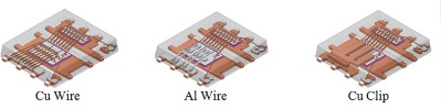 以类似的方式,单管芯片或双管芯片封装(例如IGBT二极管)对使用重型铜引线框和用于电源连接和控制的顶部焊线。如图3所示,铅焊线可以用铜夹代替,以改善芯片冷却。这种配置还提供改进的热循环性能。与单芯片封装一样,用更稳健的顶部连接取代铝焊线的模块实现了额外的芯片冷却、更大的电流密度和改进的功率循环。15多年前就提出了IGBT二极管模块的双面冷却,并已在混合动力电动汽车使用的许多汽车牵引逆变器组件中得到部署。