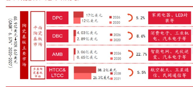 功率模块带动 DBC、AMB 陶瓷基板市场扩大。DBC陶瓷基板具有高强度、导热性 能强以及结合稳定的优质性能,而 AMB 陶瓷基板是在 DBC的基础上发展而来的,结合 强度相对更高。近年来随着新能源汽车、光伏储能行业的快速发展,IGBT 功率模块 的需求快速增长,对于 DBC、AMB 陶瓷基板的需求也不断增加。根据半邦导体网, 2020 年 DBC 陶瓷基板市场规模为 2.89 亿美元,预计 2027 年可达到 4.03 亿美元, CAGR 为 8.6%。而根据 GII 预测,2020 年 AMB 陶瓷基板市场规模为 0.65 亿美元,预 计 2027 年可达到 3.06 亿美元,CAGR 分别为 22.7%。射频组件封装促进多层陶瓷基板先进封装需求增长。多层陶瓷基板主要包括高 温共烧陶瓷基板(HTCC)以及低温共烧陶瓷基板(LTCC)。HTCC 和 LTCC 技术具有良 好的微波、导热、密封以及机械等性能,被广泛使用在射频电子元器件的封装中,在 航空航天、卫星通信以及民用通信等领域应用广泛,因此占据了不小的市场份额。根据 GII 预测,2021 年 HTCC 和 LTCC 陶瓷基板全球市场规模达到 29 亿美元,未来几年 将以 4%的复合增长率持续稳定增长。