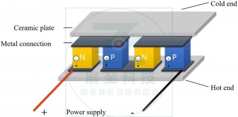 由于当时可用的材料,所涉及的大电流产生的电阻热主导了珀尔帖效应。如今,随着材料的进步,这些连接点已变得更加实用,可用作热电热泵,其功能与基于碳氟化合物的蒸汽压缩制冷相同。虽然它们仍然不如蒸汽循环装置有效,但它们没有运动部件或工作流体,并且尺寸可能非常小。纯金属的热电效应很小。如果使用N型半导体和P型半导体来代替金属,效果会大得多。通电后,在上部触点附近产生电子-空穴对,因此内部能量降低,温度降低,热量被外界吸收。在这种情况下,上部称为冷端。由于下接触的电子-空穴对的复合,内部能量增加,温度升高,热量释放到环境中。在这种情况下,下部称为热端。