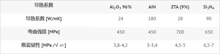 如表 1 所示,Al2O3 (96%) 表现出低热导率和低机械值。然而,24 W/mK 的导热率足以满足当今的许多标准工业应用。AlN 的一大优点是具有 180 W/mK 的极高导热率,尽管其可靠性较差。这是由于断裂韧性较低且弯曲强度与 Al2O3 相似的结果。